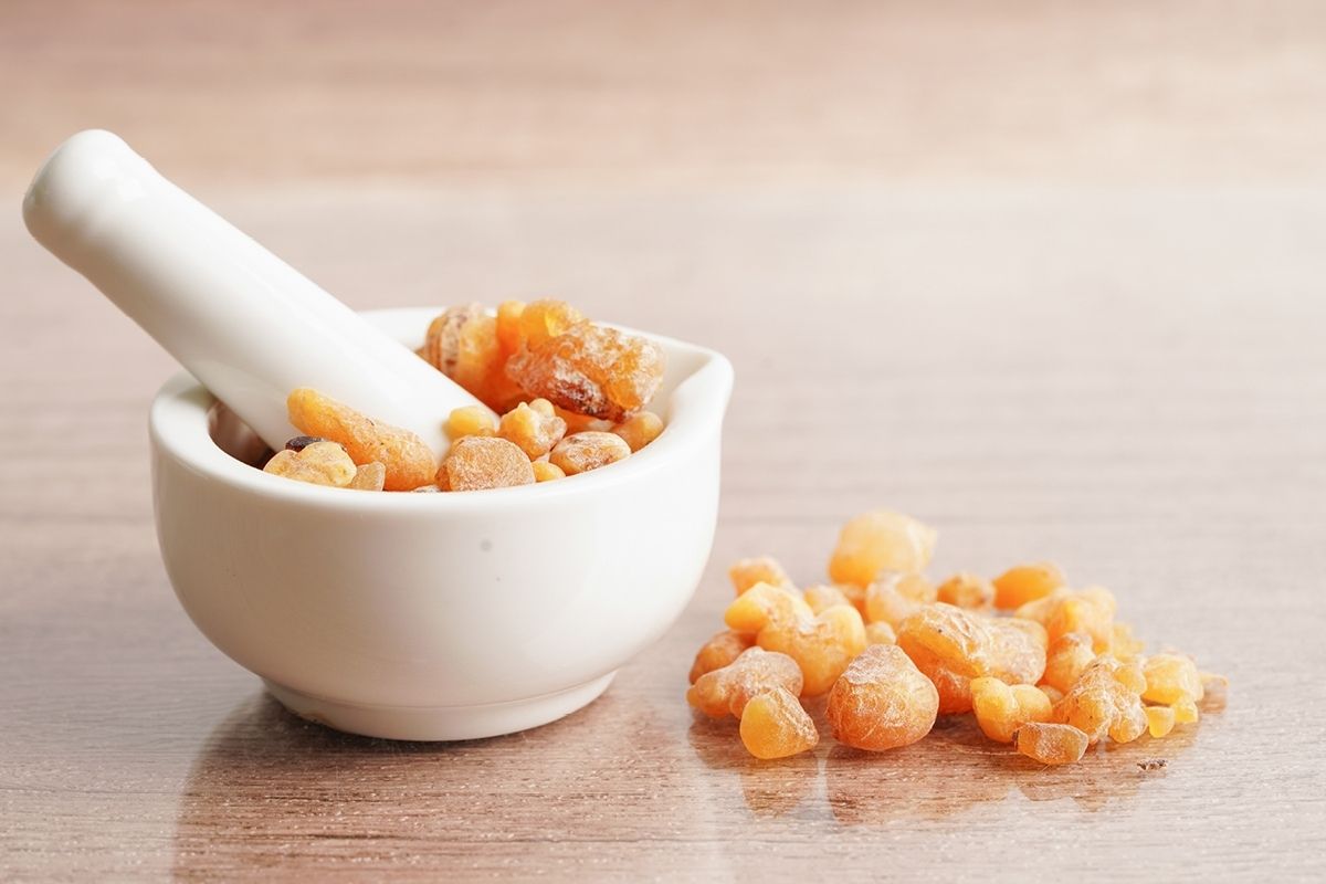Ein weiteres ayurvedisches Heilmittel ist Weihrauch. Sein Extrakt, Boswellin® Super, wird aus dem Harz des Boswellia Serrata-Baumes gewonnen. Er ist bekannt für seine beruhigende und regenerierende Wirkung auf Gelenke und Muskeln, die auf die sechs im Weihrauch enthaltenen Boswelliasäuren zurückzuführen ist, wobei insbesondere der Boswelliasäure AKBA (3-Acetyl-11-keto-ß-Boswelliasäure) die stärkste Wirkung zugeschrieben wird.